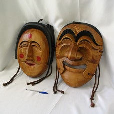 DUAS MÁSCARAS ESCULPIDAS EM MADEIRA. A PRIMEIRA (29X40X11 CM), FIGURANDO UM ROSTO FEMININO ORIENTAL, TIPO GUEIXA. POSSUI CÍRCULOS VERMELHOS PINTADOS NA TESTA E NAS BOCHECHAS; E CORDÃO EM ALGODÃO MARROM AMARRADO NAS LATERAIS. A SEGUNDA (31X43X13 CM), FIGURANDO UM ROSTO MASCULINO, COM BOCA ARTICULADA, E CORDÕES DE ALGODÃO MARROM NAS LATERAIS. ATRÁS DE CADA UMA, 'K.I.R.C.C. / KI CHAN KIM / KOREA BRASIL ASSOCIATION / 2005.5.25'. ACOMPANHA CARTA EM JAPONÊS. ACONDICIONADAS EM CAIXA DE PAPELÃO BRANCO, COM IDEOGRAMAS JAPONESES.