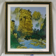 GRAVURA IMPRESSA (58,5X68,5 CM), EM TONS DE VERDE, OCRE E AZUL, MOSTRANDO UM PENHASCO COM UM LAGO NA BASE. MOLDURA (76,5X86,5 CM) EM MADEIRA TRABALHADA, EM DOURADO E VERDE. PASSE-PARTOUT BRANCO. NO CANTO INFERIOR DIREITO, 'SEOUL KOREA / MYOUNG KYOUNG DAE / GUMGANG MT'/ 2005.5.25.'.