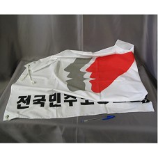 BANDEIRA (96X76,5 CM) EM TECIDO BRANCO, COM ESTAMPA DE TRÊS PERFIS HUMANOS, LADO A LADO, NAS CORES CINZA, BRANCO E VERMELHO. NA PARTE INFERIOR, IDEOGRAMAS JAPONESES. POSSUI CORDÃO EM UMA DAS LATERAIS, PAR FIXAÇÃO EM MASTRO.