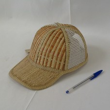 BONÉ EM PALHA DE BURITI, COM LATERAIS EM TELA DE ALGODÃO BRANCO. POSSUI ETIQUETA COM INFORMAÇÕES SOBRE O PRODUTO: 'PRODUTO: BONÉ DE PALHA DE BURITI / COD.: 28 / ARTESÃO: AMAZONAS / CRU DA AMAZÔNIA / TRAZENDO A SELVA ATÉ VOCÊ / TEL: (69) 441.6249 / WWW.CRUDAAMAZONIA.COM.BR'.