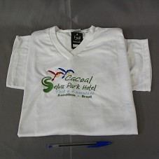 CAMISETA (TAM G) EM MALHA BRANCA, DE MANGA CURTA E GOLA EM 'V'. NA FRENTE, BORDADO EM VERDE, AZUL, VERMELHO E AMARELO, COM A INSCRIÇÃO 'CACOAL SELVA PARK HOTEL / VOCÊ E A NATUREZA / RONDÔNIA - BRASIL', E DUAS ARARAS.