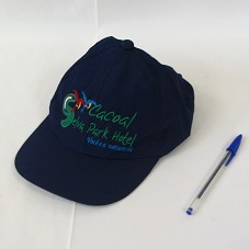 BONÉ EM TECIDO AZUL. NA FRENTE, BORDADO EM VERDE, AZUL, VERMELHO E AMARELO, 'CACOAL SELVA PARK HOTEL / VOCÊ E A NATUREZA', E DUAS ARARAS.