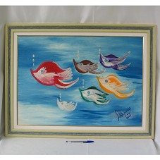PINTURA SOBRE TELA (69,5X50 CM), RETRATANDO PEIXES COLORIDOS SOBRE FUNDO AZUL. NO CANTO INFERIOR DIREITO, ASSINATURA DA ARTISTA 'ALVANIR 2004'. ATRÁS DA TELA, 'PEIXES 2004'. MOLDURA (84X64 CM) EM MADEIRA CLARA COM DETALHES DOURADOS E EM PÁTINA AZUL. PASSE-PARTOUT BRANCO COM DETALHE DOURADO.