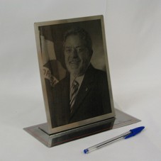 PLACA (15,5X20 CM) EM AÇO ESCOVADO, COM FOTOGRAFIA OFICIAL DO PRESIDENTE LULA, GRAVADA EM PONTILHADO. FIXADA EM BASE (21,5X9,5 CM) DE MESMO MATERIAL, CONTENDO A INSCRIÇÃO 'À VOSSA EXCELÊNCIA PRESIDENTE QUE ADMIRO DA CAPACIDADE QUE BRILHOU NA NOSSA NAÇÃO. ANTONIO GODOY LOPES / RONDONÓPOLIS - MT/2005'.