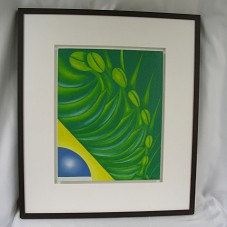 PINTURA SOBRE TELA (50X40 CM), EM TONS DE VERDE, AMARELO, AZUL E BRANCO, ALUSÃO À BANDEIRA DO BRASIL. O VERDE ESTÁ REPRESENTADO POR FOLHAGENS COM SEMENTES. NO CANTO INFERIOR DIREITO, ASSINATURA DO ARTISTA, 'ADERBAL RODRIGUES 2004'. MOLDURA (79X69 CM) EM MADEIRA ESCURA E PASSE-PARTOUT BRANCO.