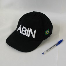 BONÉ EM BRIM PRETO. NA FRENTE, BORDADO EM BRANCO, 'ABIN'. NAS LATERAIS, A BANDEIRA DO BRASIL E 'ASSOCIAÇÃO DOS SERVIDORES DA ABIN'.