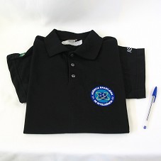 CAMISA (TAM G) GOLA PÓLO, PRETA, DE MANGA CURTA. NA FRENTE, BORDADO EM AZUL, BRANCO E AMARELO, A LOGOMARCA DA ABIN, 'AGÊNCIA BRASILEIRA DE INTELIGÊNCIA'. NAS MANGAS, A BANDEIRA DO BRASIL E 'ABIN'.