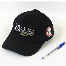 TRÊS BONÉS IGUAIS, EM BRIM PRETO. NA FRENTE, ESTAMPA EM BRANCO COM A INSCRIÇÃO '20 ANOS COMISSÃO DE FÁBRICA DOS TRABALHADORES NA DAIMLERCHRYSLER DO BRASIL - SÃO BERNARDO DO CAMPO-SP / 1984-2004'. NAS LATERAIS, 'MERCEDES-BENZ' E LOGOMARCA DA COMISSÃO.
