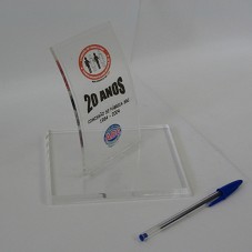 PLACA (10X14 CM), EM ACRÍLICO, LEVEMENTE ARQUEADA, COM A INSCRIÇÃO '20 ANOS COMISSÃO DE FÁBRICA SBC 1984-2004 / SINDICATO DOS METALÚRGICOS ABC / FILIADO À CUT'. FIXADA EM BASE (15X15X1 CM) QUADRADA DE MESMO MATERIAL.