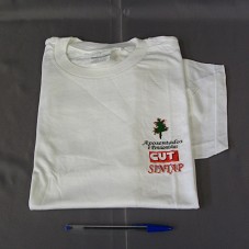 DUAS CAMISETAS IGUAIS (TAM G), EM MALHA BRANCA, DE MANGA CURTA. NA FRENTE, ESTAMPA DE UMA ÁRVORE E A INSCRIÇÃO 'APOSENTADOS E PENSIONISTAS / CUT BRASIL / SINTAP'.