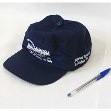 BONÉ EM TACTEL AZUL MARINHO. NA FRENTE, ESTAMPA EM BRANCO, COM A INSCRIÇÃO 'SPCBA / FUNDADO EM 11 DE OUTUBRO DE 1988 / 16 ANOS DE LUTA / 11 DE OUTUBRO DE 2004'. NAS LATERAIS, 'SINDICATO DOS PORTUÁRIOS DE CANDEIAS-BA'.