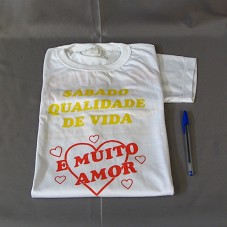 CAMISETA (TAM P), EM MALHA BRANCA, DE MANGA CURTA. NA FRENTE, EM AMARELO E VERMELHO, 'SÁBADO QUALIDADE DE VIDA E MUITO AMOR'. ATRÁS, 'PREFEITURA DE ARARUAMA / COMPLEXO QUALIDADE DE VIDA, LAZER E CULTURA MANOEL FERNANDES RIBEIRO'.