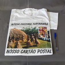 CAMISETA (TAM M), EM MALHA BRANCA, DE MANGA CURTA. NA FRENTE, ESTAMPA COM FOTO DE ÍNDIOS, DANÇANDO NUMA ALDEIA, E 'NOSSA CULTURA TUPINAMBÁ / NOSSO CARTÃO POSTAL'. ATRÁS, 'PREFEITURA ARARUAMA / AVANÇA ARARUAMA'.