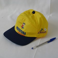 BONÉ EM BRIM AMARELO, COM ABA AZUL MARINHO. NA FRENTE, 'PREFEITURA ARARUAMA' E BRASÃO DA MESMA. NAS LATERAIS, 'PROJETO ARARUAMA BRASIL' E 'AVANÇA ARARUAMA'.