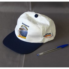 BONÉ EM BRIM BRANCO, COM ABA AZUL MARINHO. NA FRENTE, ESTAMPA COM FOTO DE UM RIO E A INSCRIÇÃO 'MOVIMENTO PRÓ-LAGO / O RENASCER DAS ÁGUAS / ARARUAMA'. NAS LATERAIS, 'PREFEITURA ARARUAMA / CIDADE QUALIDADE DE VIDA'.