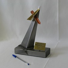 ESCULTURA (8X3,5X22,5 CM) EM AÇO, LATÃO E COBRE, REPRESENTANDO UM CATA-VENTO. FIXADA EM BASE METÁLICA RETANGULAR (18X7X3 CM), ONDE HÁ UMA PLACA DOURADA, COM A INSCRIÇÃO 'LEMBRANÇA DA CIDADE DE ARARUAMA / RJ / AO PRESIDENTE LULA / PREFEITURA DE ARARUAMA / FRANCISCO RIBEIRO / PREFEITO / 12 DE JULHO DE 2005'.