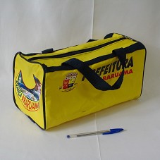SACOLA (34X16X18CM) EM LONA AMARELA, COM DETALHES EM AZUL MARINHO, E ALÇA CURTA. NAS LATERAIS, POSSUI AS INSCRIÇÕES: 'PREFEITURA ARARUAMA' E BRASÃO; 'AVANÇA ARARUAMA'; 'PROJETO ARARUAMA BRASIL'.