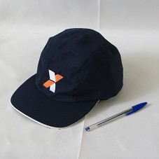 DOIS BONÉS IGUAIS, EM TACTEL AZUL MARINHO. NA FRENTE, BORDADO EM BRANCO E LARANJA, O SÍMBOLO DO BANCO CAIXA ECONÔMICA FEDERAL. ATRÁS, 'CAIXA'.