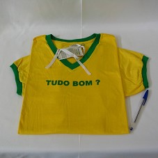 CAMISETA (TAM XG) EM MALHA AMARELA, COM DETALHES VERDES NA GOLA E NAS MANGAS. POSSUI A INSCRIÇÃO 'TUDO BOM?', NA FRENTE. ACOMPANHA INFORMATIVO SOBRE O PRODUTO E FITA EM CETIM BRANCO, COM A INSCRIÇÃO 'ACTION MONDIALE CONTRE LA PAUVRETE - 2005 PLUS D'EXCUSES / WWW.2005PLUSDEXCUSES.ORG'.