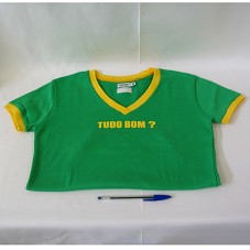 CAMISETA (TAM M) EM MALHA VERDE,TIPO BABY LOOK, COM DETALHES AMARELOS NA GOLA E NAS MANGAS. POSSUI A INSCRIÇÃO 'TUDO BOM?', NA FRENTE.