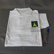 CAMISA (TAM G) GOLA PÓLO, BRANCA, DE MANGA CURTA. NA FRENTE, ESTAMPA COM EM VERDE, AMARELO E AZUL, DESENHO LEMBRANDO A TORRE EIFFEL E A BANDEIRA DO BRASIL, COM A INSCRIÇÃO 'EXPOSIÇÃO VIAGEM AOS BRASIS. O ANO DO BRASIL NA FRANÇA TEM UMA NOVA ATRAÇÃO.'. ATRÁS, LOGOMARCAS DE INSTITUIÇÕES BRASILEIRAS.