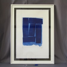 QUADRO (50,5X69,5 CM) COM MOLDURA EM MADEIRA PINTADA DE BRANCA, PASSE-PARTOUT BRANCO, E FECHAMENTO TIPO SANDUÍCHE DE VIDRO. POSSUI PINTURA (24X34,5 CM) EM PAPEL CANSON BRANCO, DE NÚMERO '8/30', EM TONS DE AZUL, COMPOSIÇÃO COM RETÂNGULOS NA VERTICAL E HORIZONTAL. NO CANTO INFERIOR DIREITO, ASSINATURA DO ARTISTA, 'CLEMENT 04'. ATRÁS, POSSUI DOIS SELOS, UM DO 'ATELIER LUC-MICHEL' E OUTRO 'LENSEIGNEMENT TECHNIQUE-AUX / MEILLEURS OUVRIERS DE FRANCE'.