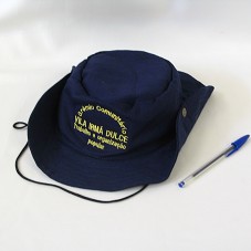 CHAPÉU EM BRIM AZUL MARINHO, TIPO AUSTRALIANO. NA FRENTE, BORDADO EM AMARELO, 'GRÊMIO COMUNITÁRIO / VILA IRMÁ DULCE / TRABALHO E ORGANIZAÇÃO POPULAR'.