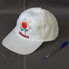 BONÉ EM TECIDO BRANCO. NA FRENTE, ESTAMPA MOSTRANDO SOL E VEGETAÇÃO, INSCRITOS NO CONTORNO DO MAPA DE FORTALEZA, E A INSCRIÇÃO 'FETRAECE'. ATRÁS, FETRAECE / (085) 3231-5887 / WWW.FETRAECE.ORG.BR'.