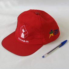 BONÉ EM TECIDO VERMELHO. NA FRENTE, ESTAMPA BRANCA, COM A INSCRIÇÃO 'COHAB-PI' E LOGOMARCA. NAS LATERAIS, 'PIAUÍ. É FELIZ QUEM VIVE AQUI.' E 'PIAUÍ GOVERNO DO DESENVOLVIMENTO'.