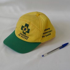 BONÉ EM BRIM AMARELO, COM ABA VERDE. NA FRENTE, 'MINISTÉRIO DA SAÚDE', E LOGOMARCA. NAS LATERAIS, 'PROGRAMA SAÚDE DA FAMÍLIA' E 'AGENTE COMUNITÁRIO DE SAÚDE'.