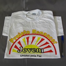 CAMISETA (TAM G), EM MALHA BRANCA. NA FRENTE, EM AMARELO, VERMELHO E PRETO, ESTAMPA MOSTRANDO UM SOL, E A INSCRIÇÃO 'PROJETO RENASCER / JOVEM UNIDOS PELA PAZ'. ATRÁS, 'DIGA NÃO À VIOLÊNCIA E FIM ÀS DROGAS! / APOIO: RÁDIO REGIONAL SUL FM 103,5 MHZ / VILA IRMÃ DULCE'.
