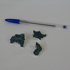 TRÊS BROCHES, EM PRATA 950, COM FRENTE EM VITRAL MOSAICO, PREDOMINANDO O TOM DE VERDE. O PRIMEIRO, FORMATO DO MAPA DO BRASIL (4X4 CM); O SEGUNDO, DO ESTADO DO PIAUÍ (3,5X2 CM); O TERCEIRO, DO MARANHÃO (3,5X2 CM). ACONDICIONADOS EM ESTOJO PLÁSTICO PRETO.