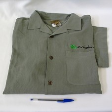CAMISA SOCIAL (TAM G), DE MANGA CURTA, EM SEDA DE TONALIDADE ESVERDEADA. NA FRENTE, BORDADO EM VERDE E PRETO, 'EVADER' E LOGOMARCA.
