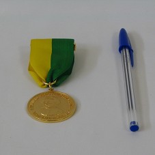 MEDALHA DO MÉRITO AGRÔNOMO FRANCISCO PARENTES (40 MM). CONFECCIONADA EM METAL DOURADO, PRESA À FITA VERDE E AMARELA, COM BARRETA NA PARTE SUPERIOR. NO ANVERSO, EFÍGIE DE ROSTO MASCULINO E A INSCRIÇÃO 'MEDALHA DO MÉRITO FRANCISCO PARENTES / LABOR SIGNUN NOSTRUM EST'. NO REVERSO, 'FLORIANO / 1897'. ACONDICIONADA EM ESTOJO FORRADO DE VELUDO VERDE.
