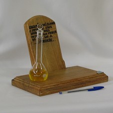 PLACA EM MADEIRA (13X20X2 CM), COM A INSCRIÇÃO PINTADA EM PRETO 'QUANDO VOCÊ ELIMINA O IMPOSSÍVEL. O QUE SOBRA POR MAIS INCRÍVEL QUE PAREÇA SÓ PODE SER A VERDADE.'. FIXADA EM BASE DE MESMA MATERIAL (28X16X3 CM). NA PARTE ESQUERDA DA BASE, UM VIDRO DE LABORATÓRIO COM LÍQUIDO AMARELADO DENTRO. NA PARTE DIRETA, PLACA EM METAL COM A INSCRIÇÃO 'BRASIL ECODIESEL'.