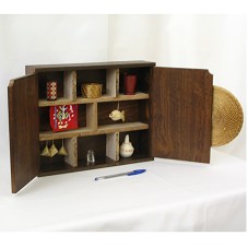 CAIXA EM MADEIRA (35X28X8 CM), TIPO ORATÓRIO, COM CÍRCULO CONFECCIONADO EM CAPIM-DOURADO FIXADO EM UMA DAS PORTAS. NA PARTE INFERIOR DIREITA, 'MARCELO MIRANDA / GOVERNADOR / TOCANTINS'. INTERNAMENTE, POSSUI OITO NICHOS DIVIDIDOS EM TRÊS NÍVEIS. EM CADA NICHO, OBJETOS E HISTÓRIAS QUE RETRATAM AS FESTAS, TRADIÇÕES E COSTUMES TOCANTINENSES: BANDEIRA DO DIVINO ESPÍRITO SANTO; CAIXINHA DE SEGREDO; QUARTZO DE CRISTAL; PEIXE (EM PALHA); PILÃO DE MADEIRA, SIMBOLIZANDO A CULINÁRIA; ARTES INDÍGENAS, EM PALHA E ARGILA E CAPIM-DOURADO. NA PARTE POSTERIOR EXTERNA DA CAIXA, TEXTO COM DESCRIÇÃO DO OBJETO; E ETIQUETA COM A INSCRIÇÃO 'DESIGN LARS DIEDERICHSEN'. POSSUI DOIS GANCHOS PARA PENDURAR EM PAREDE; E ELÁSTICO PARA FECHAR AS PORTAS. ACOMPANHA CARTÃO DO AGENTE.