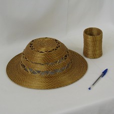 CHAPÉU (32,5X32,5X10,5 CM) CONFECCIONADO EM CAPIM-DOURADO. POSSUI TRÊS FRISOS VAZADOS, COM DESENHO DE ZIG-ZAG, EM SEU PERÍMETRO; E, ETIQUETA 'ARTESANATO DO TOCANTINS', COM INFORMAÇÕES SOBRE O PRODUTO. PORTA-LÁPIS (8,2X8,2X10,5 CM) CILÍNDRICO, CONFECCIONADO EM MESMO MATERIAL. ACOMPANHA PRENDEDOR DOURADO, COM FLORES NA PARTE SUPERIOR.