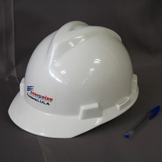 CAPACETE DE OBRA, NA COR BRANCA. NA FRENTE, ADESIVO COM A INSCRIÇÃO 'ENERPEIXE / PRESIDENTE LULA', E LOGOMARCA DA EMPRESA.
