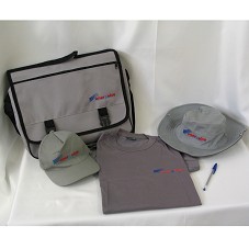 CAMISETA (TAM GG) EM MALHA CINZA. NA FRENTE, ESTAMPADO EM AZUL E VERMELHO, 'ENERPEIXE' E LOGOMARCA. BONÉ E CHAPÉU EM PANO (TIPO AUSTRALIANO), EM BRIM CINZA, COM MESMA ESTAMPA BORDADA NA FRENTE. ACONDICIONADOS EM BOLSA/PASTA, NA COR CINZA, COM DIVISÕES INTERNAS, ALÇA LONGA E CURTA, TENDO MESMA ESTAMPA BORDADA NA FRENTE.