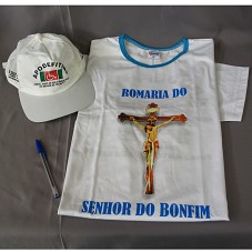 CAMISETA (TAM G) EM MALHA BRANCA, COM FRISO AZUL CLARO NA GOLA E NAS MANGAS. NA FRENTE, ESTAMPA DE UM CRUCIFIXO E 'ROMARIA DO SENHOR DO BONFIM'. ATRÁS, 'APODEFITINS / ... / PALMAS-TO / PRES.: ANTÔNIO SOARES' E LOGOMARCA DA ASSOCIAÇÃO. BONÉ EM TECIDO BRANCO, COM MESMA LOGOMARCA (SÍMBOLO DO PORTADOR DE DEFICIÊNCIA FÍSICA, DENTRO DE UM RETÂNGULO NAS CORES VERDE E VERMELHA). ACOMPANHA CARTÃO DE VISITA.