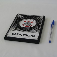 QUADRO (13X18X2 CM) EM MADEIRA FORRADA DE PAPEL CAMURÇA PRETO. NA FRENTE, DESENHO DO EMBLEMA DO TIME DE FUTEBOL CORINTHIANS E NOME. CIRCUNDANDO-O, COMPOSIÇÃO FEITA COM LINHAS DE BORDAR, NAS CORES BRANCO E PRETO, FORMANDO ALTO-RELEVO. ATRÁS, 'LEMBRANÇA DO ARTESÃO DE ALAGOAS / ...BETO / DEUS SEJA LOUVADO / PARA O PRESIDENTE LULA'.