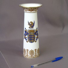 JARRA EM CERÂMICA (7X7X21 CM), DE CORPO CILÍNDRICO, AFUNILANDO PARA PARTE SUPERIOR. POSSUI PINTURA EM DOURADO, E NA FRENTE, O DESENHO DO ESCUDO DE ARMAS DE D. ANTÔNIO ÁLVARES DA CUNHA, EM DOURADO E AZUL. NO FUNDO DA BASE, A INSCRIÇÃO 'V CENTENÁRIO DA DESCOBERTA DO BRASIL POR PEDRO ÁLVARES CABRAL - 1500-2000 / ESCUDO DE ARMAS DE D. ANTÔNIO ÁLVARES DA CUNHA / 1º CONDE DA CUNHA / 9º VICE-REI DO BRASIL (1763-1767)'. ACONDICIONADA EM CAIXA DE PAPELÃO VERDE ESCURO, COM LOGOMARCA DO FABRICANTE.