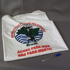 BANDEIRA (90X74,5 CM) EM TECIDO BRANCO. NO CENTRO, EM VERMELHO, A INSCRIÇÃO 'MOVIMENTO DOS ATINGIDOS POR BARRAGENS / BRASIL / ÁGUAS PARA VIDA NÃO PARA MORTE!', E LOGOMARCA DO MOVIMENTO, FIGURA HUMANA SOBRE POSTE DE REDE ELÉTRICA, TENDO AO FUNDO O MAPA DO BRASIL E ONDAS DE ÁGUA'.