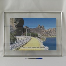 QUADRO (53,5X41 CM), TIPO SANDUÍCHE DE VIDRO, COM MOLDURA EM ALUMÍNIO POLIDO. EMOLDURA FOTOGRAFIA IMPRESSA (42X29,5 CM) MOSTRANDO UMA PASSARELA, COM ROCHEDOS AO REDOR, DANDO PARA UM AÇUDE.