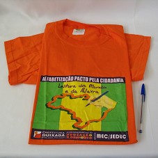 CAMISETA (TAM G) EM MALHA LARANJA, DE MANGA CURTA. NA FRENTE, ESTAMPA EM AZUL, VERDE, AMARELO E BRANCO, COM DESENHO DO MAPA DO BRASIL, E A INSCRIÇÃO 'ALFABETIZAÇÃO PACTO PELA CIDADANIA / LEITURA DO MUNDO E DA PALAVRA / PREFEITURA DE QUIXADÁ ... / SECRETARIA MUNICIPAL DA EDUCAÇÃO E DESPORTO /... '.