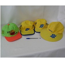 QUATRO BÓNES. DOIS EM TACTEL AMARELO, COM LOGOMARCA DO BANCO DO BRASIL BORDADA NA FRENTE; NAS LATERAIS, UMA FLOR E 'DRS CAICÓ-RN'; E, ATRÁS, EM UM, 'LULA, NO OUTRO, 'MARISA'. UM BONÉ FEMININO, TIPO VISEIRA, EM TACTEL AMARELO, COM MESMA LOGOMARCA BORDADA NA ABA, E, 'MARISA', NA FRENTE. E, UM BONÉ EM TACTEL VERDE, COM ABA LARANJA. NA FRENTE, BORDADO EM VERMELHO, AMARELO E PRETO, UM SOL E 'PIAUÍ / TERRA QUERIDA FILHA DO SOL DO EQUADOR'. NAS LATERAIS, BANDEIRA DO PIAUÍ, E LOGOMARCA DO BANCO DO BRASIL.