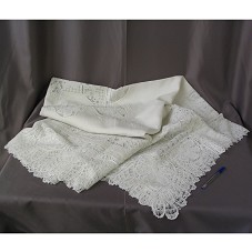 TOALHA DE MESA (180X300 CM) EM LINHO BRANCO, TODA TRABALHADA EM RENDA DE BILRO, COM MOTIVOS FLORAIS.