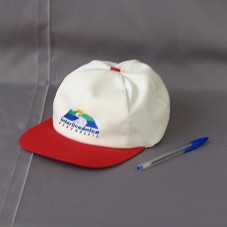 BONÉ EM TECIDO BEGE, COM ABA VERMELHA. NA FRENTE, BORDADO EM AZUL, VERDE, CINZA, BRANCO , VERMELHO E AMARELO, DESENHO DE UMA ESTRADA BEIRANDO A ÁGUA E A VEGETAÇÃO, INDO DE ENCONTRO AO SOL; E, A INSCRIÇÃO 'INTEROCEÁNICA PERÚ BRASIL'. ATRÁS, EM VERMELHO, 'INTEGRACION Y DESARROLLO'.