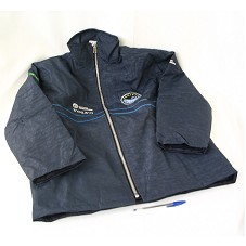 JAQUETA (TAM M) EM TECIDO AZUL MARINHO, DE MANGA COMPRIDA, ACOLCHOADA. NA FRENTE, BORDADO EM AZUL, BRANCO E AMARELO, A INSCRIÇÃO 'PROJETO PACIFICO / BOLÍVIA / BRASIL / CHILE / PARAGUAI / PERU / ARGENTINA', E LOGOMARCA DO PROJETO; E, 'EXPRESSO ARAÇATUBA / VOLVO'. ATRÁS, MESMA LOGOMARCA E 'TRABALHANDO PELA INTEGRACIÓN DA AMÉRICA'. JAQUETA PARECE SER IMPERMEÁVEL.
