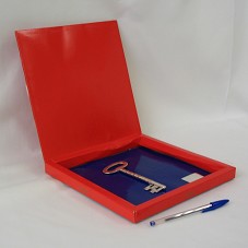 CHAVE DA CIDADE DE PUERTO MALDONADO (14,5 CM), EM METAL PRATEADO, COM DETALHES EM METAL DOURADO. ACONDICIONADA EM CAIXA DE PAPELÃO FORRADA COM PAPEL VERMELHO. NA PARTE INTERNA, PLACA COM A INSCRIÇÃO 'EL ALCALDE EDUARDO ZAVALA AL SR. PRESIDENTE LUIS INACIO LULA DA SILVA'.
